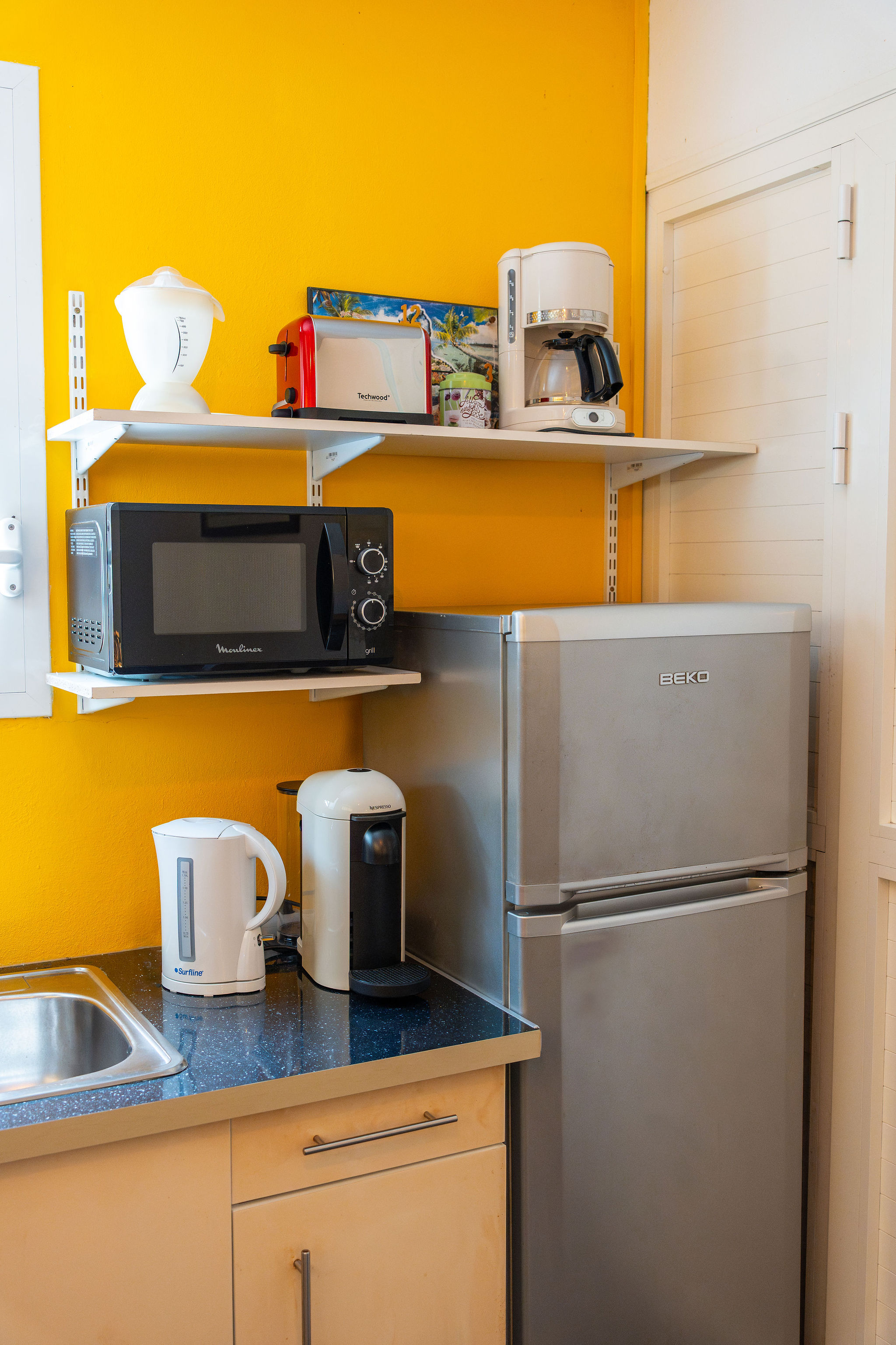 Bouilloire électrique, cafetière, congélateur, four à micro-ondes, grille-pain, verres à vin, réfrigérateur, plaque de cuisson, vaisselle et couverts